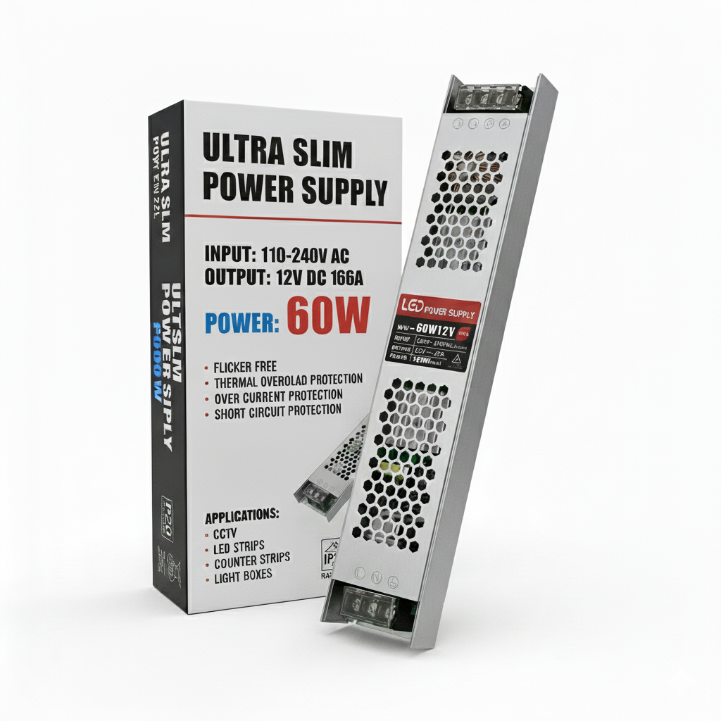 Power your 12V lighting with the slim and efficient LEDSone 12V 60W LED Power Supply. This ultra-slim LED driver is expertly designed to convert 110-240V AC household current into a stable constant voltage 12V DC, providing 5A of clean, flicker-free power.