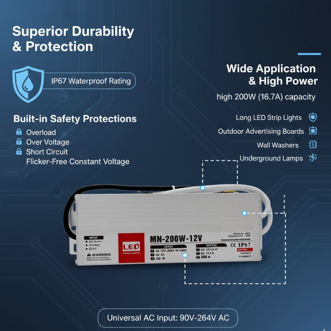 - Wide Application & High Power: With a capacity of 200W (16.7A), it’s ideal for large-scale projects and high-power LED systems, including wall washers, LED strip lights, and underground lamps.